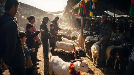Lively outdoor market scene with people viewing goats and sheep, market stalls in background under bright sunlight