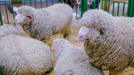Group of sheeps at agricultural animal exhibition. Farming, agriculture industry and animal husbandry concept