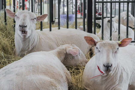 Flock of white sheep lying and eating hay at agricultural animal exhibition, small cattle trade show. Farming, feeding, agriculture industry, livestock and animal husbandry concept