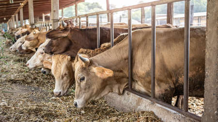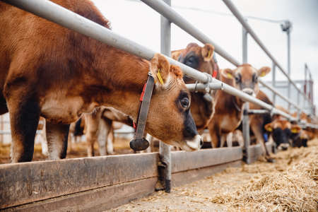 Dairy farm livestock industry. Red jersey cows stand in stall eating hay