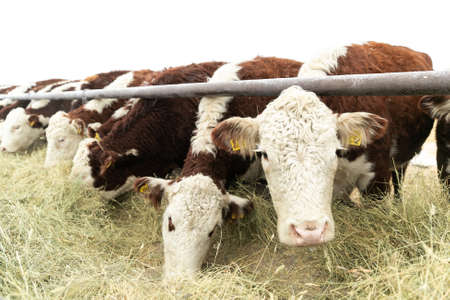 industrial cultivation of cows on a farm Cattle eating grass outdoors in winter