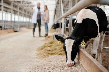 Livestock Farm - cows grazing in stable beef production. Live Animals Trade. Agriculture Farm with Live Animals in Stable. Cows Grazing and eating Hay.