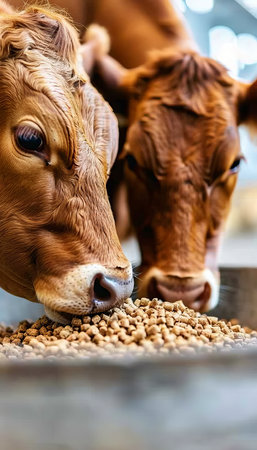 Group of jersey calves feeding on hay inside a barn on a modern dairy farm, representing sustainable agriculture and livestock management
