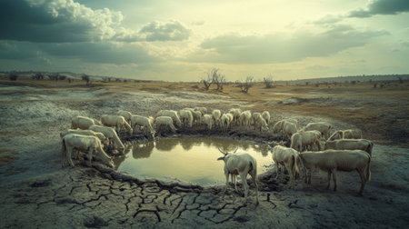 Desperate animals crowd a parched waterhole, seeking relief in a dry, cracked environment with few remaining trees and ominous clouds.