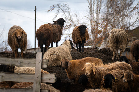 selective focus of herd of adorable brown sheep grazing in corral at farm