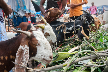 Kolkata, West Bengal, India - 11th August 2019 : Goats are being fed, goats are being sold in market during Eid al-Adha or Eid Qurban or Festival of the Sacrifice.