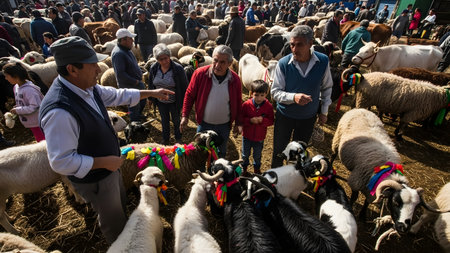 Many people and children at a busy outdoor market, viewing sheep and goats decorated with colorful ribbons