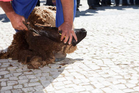Mature farmer shearing sheep for wool outdoors with traditional manual scissors