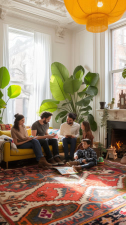 A family of five is sitting in a living room with a fireplace and a large oriental rug on the floor.