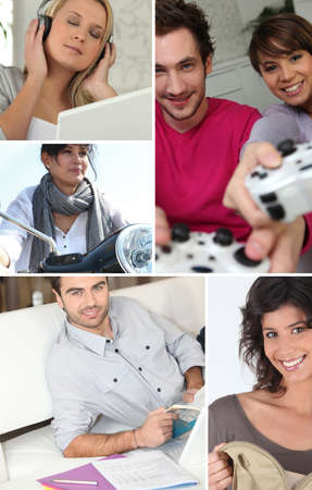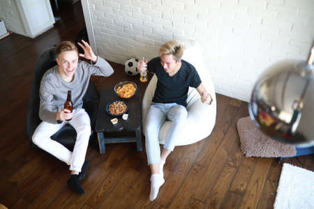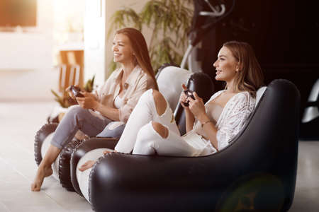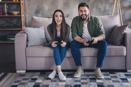Photo of cheerful positive funny people sitting on couch playing playstation together living room loft interior apartment indoors