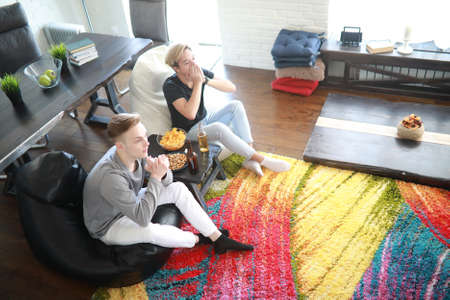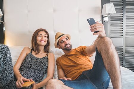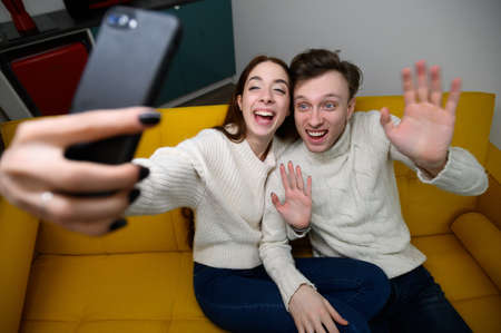 a young married couple at home. They sit on the couch and take selfies or talk on video communication