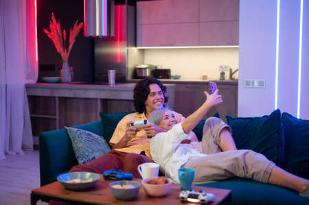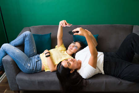 Relaxed attractive women taking a selfie together while resting on the sofa