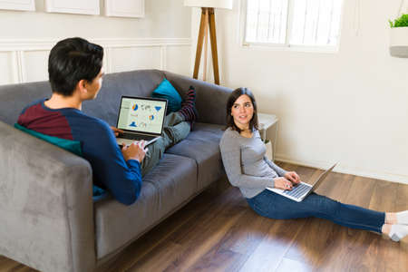 Gen z couple at home working remotely together. Young woman and man working from home as brokers on the finance business