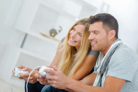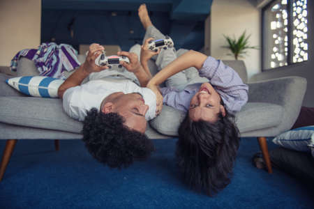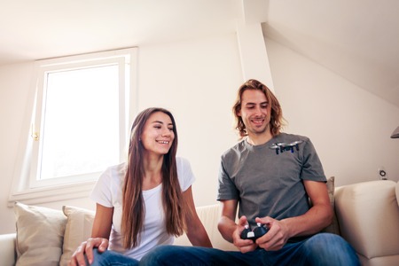 Engaged couple has fun playing video games - lovers are joking while spending free time together