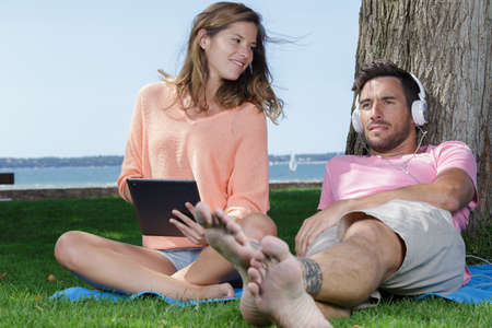 Modern technology devices. Young couple outdoor against sky man with smartphone, woman with tablet enjoying summer holiday