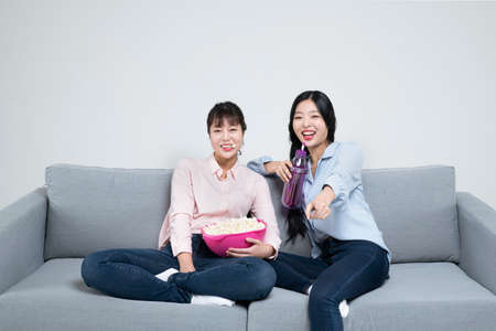 two Asian sisters, women with various facial expressions on sofa eating popcorn watching television