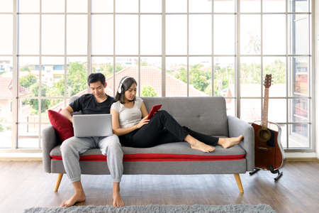 Young businessman and woman working from home-office with morning sunshine. they are communicating on social networks and searching for information online.
