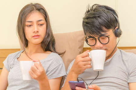 Young Asian couple sitting on couch in living room, a man playing game on smart phone while woman pouting to him.