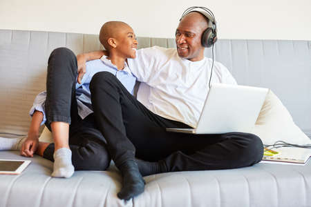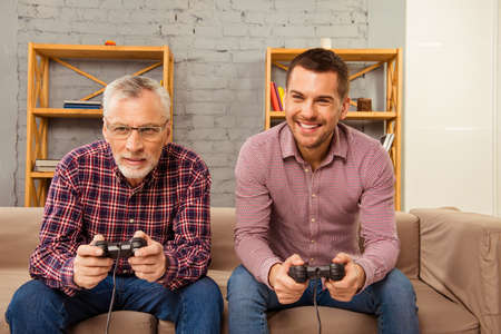 Handsome father and his son playing video games and laughing while sitting on a sofa