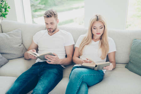Spending nice time at home. Beautiful young loving couple bonding to each other and smiling while woman holding a book