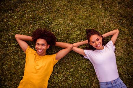 Top above high angle view portrait of attractive cheerful partners friendship lying on grass peaceful relax fresh air free time outdoors