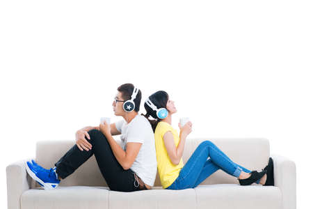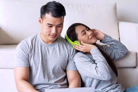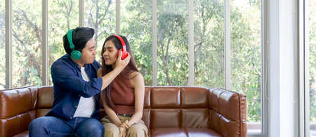Young lovers spend time together on holidays in the living room. Asian man help his girlfriend listen to music with headphones.