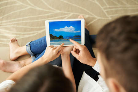 Loving couple sitting on a sofa, looking at the photos on digital camera display