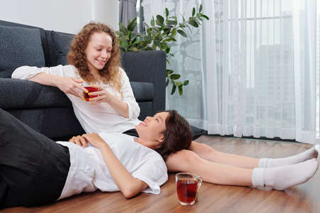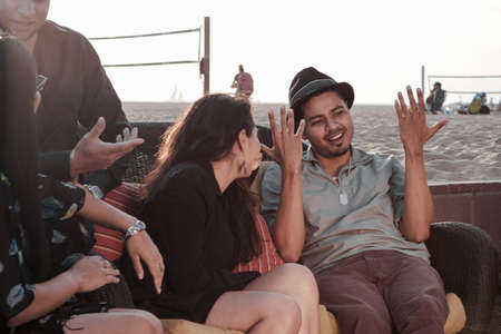 Cheerful young woman laughing and flirting with a college man. Diverse friends hanging out and sitting together in the living room