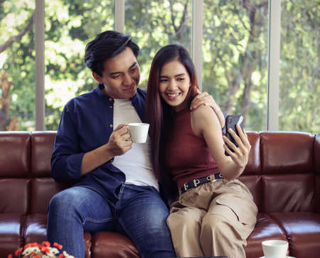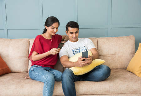 Indian asian young couple using smartphone together while sitting on sofa or couch and modern interior space or home