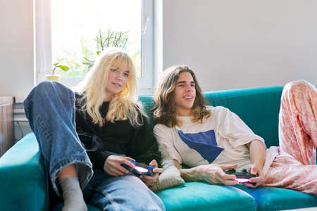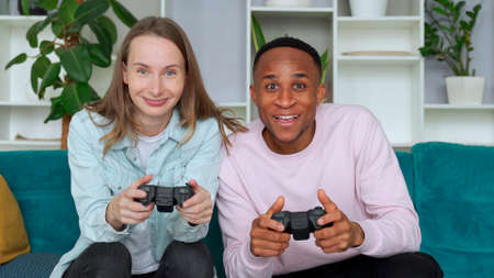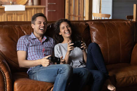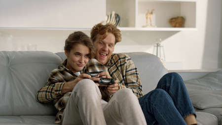 Portrait of funny comic couple holding joy sticks in hands playing video game enjoying activity sitting on sofa indoors