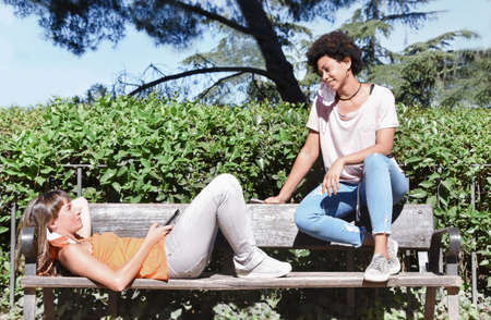 Two young women of different ethnicity chat while sitting on a bench outdoors, with their face mask removed but keeping a safe distance, on a summer day
