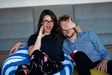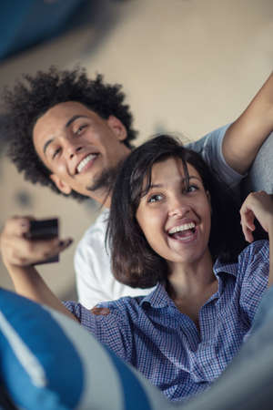 Portrait of an excited young couple relaxing on a couch at home while watching TV and eating popcorn