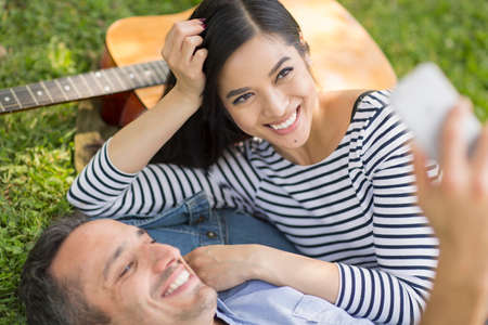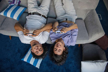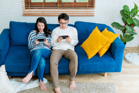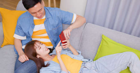 high angle view of asian couple looking some information on the internet together with smart phone at new home happily-woman lying on man legs