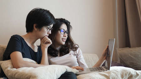 Couple cheerful spend leisure with laptop surfing web watch video. Surfing web together. Couple in love relaxing surfing internet for fun. Family leisure. Modern young people leisure internet surfing