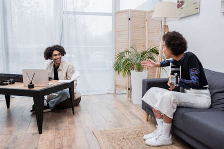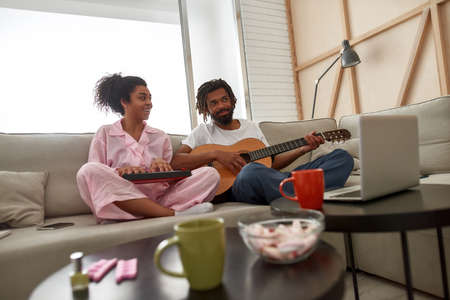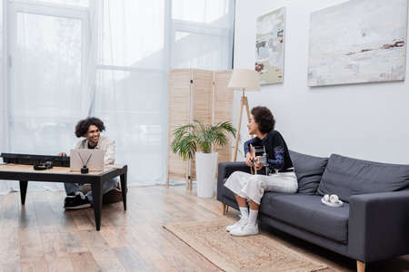 Smiling african american man looking at girlfriend with acoustic guitar near laptop and synthesizer at home