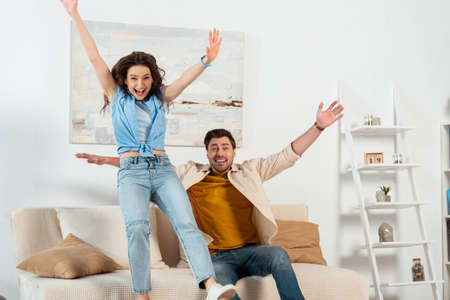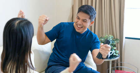 Happy young couple playing and winning a game funny activity sitting home on a sofa