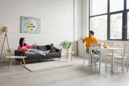 smiling young woman lying with book on couch and talking with boyfriend sitting at table with laptop in living room