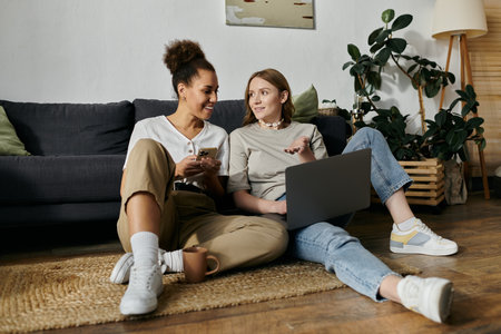 A lesbian couple relaxes at home, one using a laptop, the other on their phone.
