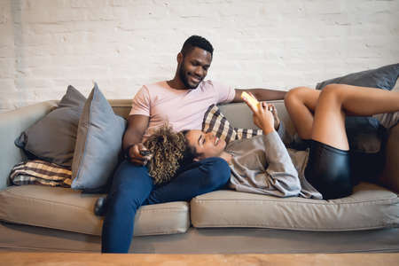 Young international couple of white woman and black man sit on couch at home, look at side. Violet wall background with free space for text.
