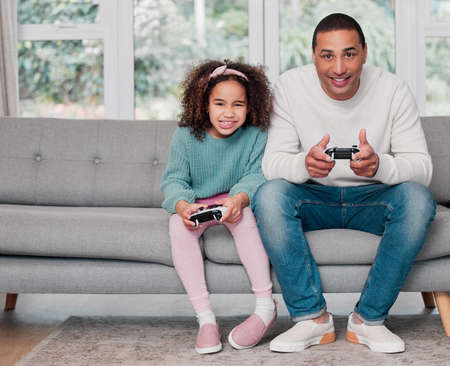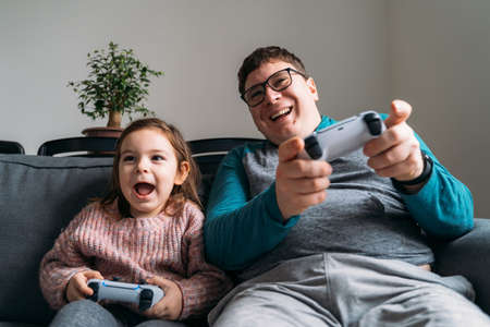 The game gets more exciting with every minute. Portrait of a little girl and her father playing video games together at home.