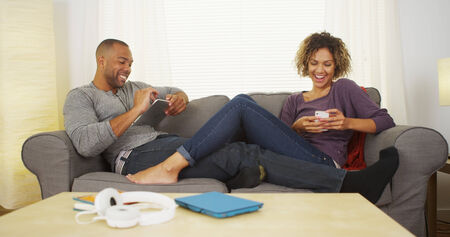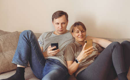 Man and woman sitting on a couch and holding smartphones in their hands. Man looking into the phone his wife