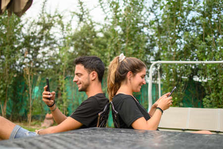 Emotions. Young caucasian couple sitting back to back and looking at their mobile phone an smiling. Horizontal. With copyspace.