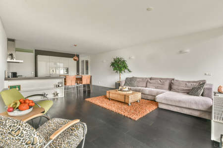 Interior of bright living room with stylish furniture