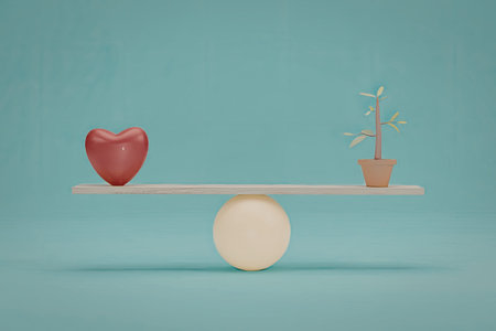 A red heart and a potted plant are balanced on a seesaw against a light blue background, symbolizing the harmony between love and growth.