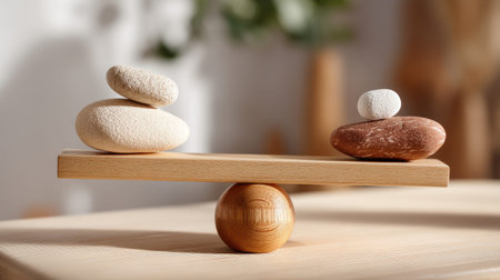 A tranquil scene featuring smooth stones balanced on a wooden plank, conveying serenity and calmness. Ideal for themes of wellness and balance.