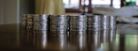 Stacks of coins on a table with reflections in the glass. Shallow depth of field focus on first stack of coins.