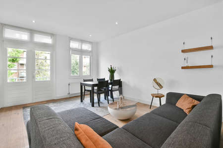 a living room with wood flooring and white cabinetd walls, including a grey couch in the middle part of the room