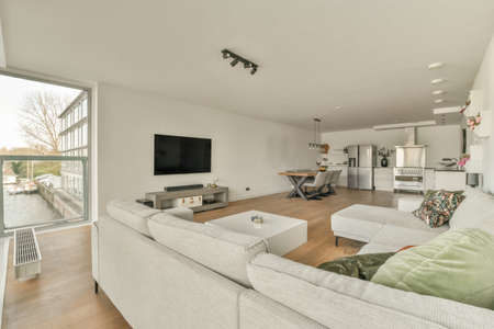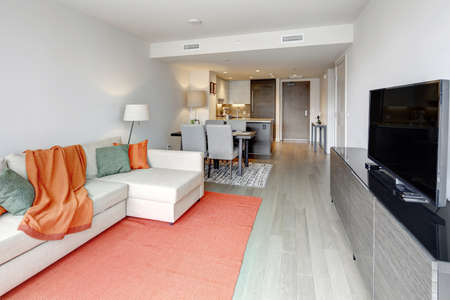 Interior of a new house, living room with white sofa and tv