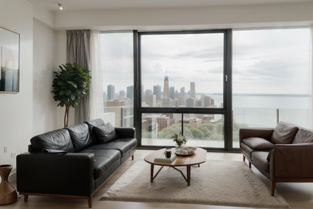 CHICAGO, IL, USA - MARCH 20, 2021: An elegant living room with a grey sofa and black leather chair surrounding a wooden table. The windows showcase a beautiful view to the city.