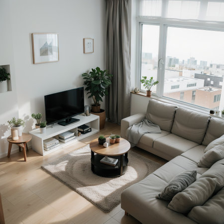 Wide-angle shot of a modern living room filled with sunlight, neutral furnishings, cozy textures, and elegant minimalist design for apartment lifestyle